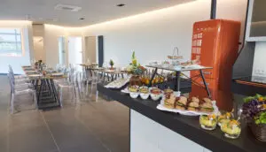 Der großzügige, 90 m² große Empfangsbereich bildet das Herz Ihres Events und verbindet alle Seminarräume miteinander. Mit seiner stilvollen, hochwertigen Empfangstheke – ausgestattet mit Kühlschubladen, Weinkühlschrank und einer professionellen Gastro-Kaffeemaschine – heißt er Ihre Gäste vom ersten Moment an willkommen.