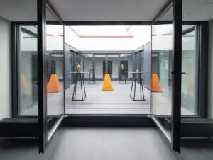 Direkt angeschlossen befindet sich der lichtdurchflutete Lichthof, der sich perfekt für Frischluftpausen oder informelle Gespräche im Freien eignet. Durch seine zentrale Lage ist der Empfangsbereich ein lebendiger Treffpunkt und die verbindende Mitte aller Seminarräume – ideal, um Menschen zusammenzubringen und Veranstaltungen harmonisch zu begleiten.